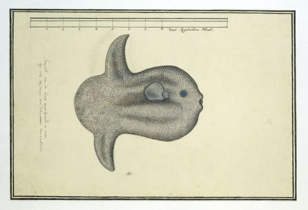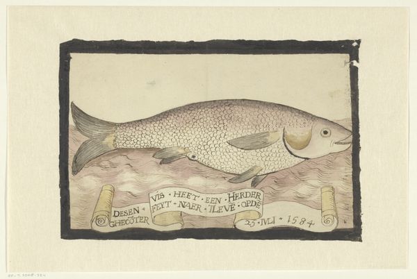Curator: This drawing, "Buttlenose whale (Hyperoodon rostratus)" by Adriaen Coenen, dating from 1584, uses ink and watercolor on paper. It's charming, but a bit naive, wouldn't you say? What can you make of this interesting portrayal? Editor: I am drawn to the use of such rudimentary materials to convey knowledge, but how do we place the whale within the context of artistic production and broader societal implications? Curator: Exactly! Consider the materials available to Coenen, and how he’s using them. Ink, watercolor, readily accessible, practical. It wasn't about lavish display but documenting the natural world as he understood it. What kind of labor goes into capturing, observing, and rendering this creature? And who was consuming these images? Editor: So, it's less about the finished product and more about the means and circumstances of its creation. It challenges the traditional view of art as simply aesthetic, by emphasising its utility within scientific pursuits, right? I notice the handwritten script along the borders of the paper; would that play a part in Coenen’s creative choices here? Curator: Precisely! The text anchors the image within a specific time and place. How does the inscription change the reading of the image for you? Editor: It makes it feel functional, tied to knowledge sharing. Curator: Indeed. Coenen used affordable materials, which facilitated both knowledge production and a more democratic access to such information, challenging our present conceptions of exclusivity. Editor: This has really transformed how I view not just the piece but similar historical works. Thanks. Curator: My pleasure. Examining the "how" and "why" of its making unveils a whole other world.