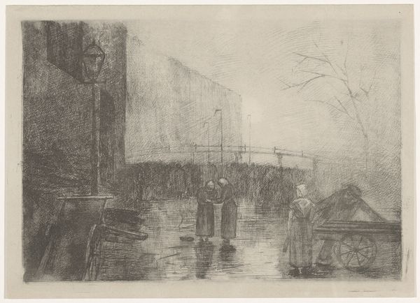 Curator: Let's delve into this etching by Simon Moulijn, "Stadsgezicht bij nevelachtig weer," or "Cityscape in Foggy Weather," created in 1886. It resides here at the Rijksmuseum. Editor: Immediately, a mood washes over me... a melancholy, misty twilight zone. The reflections shimmer just so, blurring reality, making it all feel transient and heavy with unspoken stories. Curator: Absolutely. Moulijn captures the atmospheric conditions masterfully, situating the viewer within a specific urban moment. Note the strategic use of light, how it interacts with the wet cobblestones. The print encapsulates realism, but tinged with the pictorialist sensibilities of the era. Editor: You know, it's like looking at a half-remembered dream. The two figures huddled together feel secretive, lost in a private conversation while the other with the pushcart trudges on. Is it me, or do they mirror anxieties of urban alienation that still resonate today? Curator: Indeed. The artwork, being an etching, carries the socio-historical weight of printmaking as a medium of dissemination. How the image is readily and widely reproduced brings to the forefront questions about public and private space, access, and the visibility of these urban dwellers. Editor: There’s a tenderness I sense amidst the grit. A resilience maybe, mirrored in the glimmer off those rain-slicked streets. Makes me want to wander into that cityscape and become part of their quiet drama. Curator: And think of the implications of his chosen style and subject. Moulijn captures the everyday, turning ordinary lives into moments of poignant beauty. We are prompted to engage with working class people whose perspectives and existences were historically dismissed or disregarded. Editor: You put it into perspective. I think next time it rains, I might just take a walk and notice my surroundings more fully, and wonder about the unseen dramas playing out around me, thanks to Simon Moulijn. Curator: A vital response. By centering these considerations we hopefully gain both knowledge and perhaps even more, greater empathy for the subjects the work portrays, the society it depicts, and our own role as interpreters of the past.