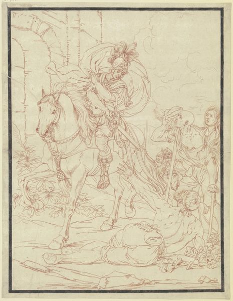 Curator: Here we have an intriguing drawing by Jakob Jung, aptly titled "Jagender Jüngling zu Pferd, eine Blumen gießende junge Frau erblickend" – or, “Hunting Youth on Horseback, Catching Sight of a Young Woman Watering Flowers." It's currently held at the Städel Museum. Editor: My immediate impression is of delicacy, almost ethereality. The composition feels intentionally unfinished, lines soft, edges blurring the figures with their landscape. It captures a fleeting, almost dreamlike quality. Curator: Indeed. This is an early work that signals Jung’s engagement with Romanticism, and we can see its emphasis on emotionality, individualism, and the awe of nature, with specific references to the social dynamics that influence interactions with nature. What is the power dynamic between the maiden and the youth on horseback? Is she working? Is he entitled? Editor: The incomplete rendering reinforces this sense of transience. Observe how the lines barely contain the figures. There’s a tension created between definition and dissolution, almost like an allegory for desire—always just out of reach. Also, notice the relationship between the landscape, especially how the verticals draw the eye and force one to reconcile both elements—maiden/youth and tree/horizon, foreground and background. Curator: I find it significant that Jung chose this scene to depict – a hunting youth distracted, perhaps captivated, by a woman engaged in a peaceful, nurturing act. How can the composition serve as a feminist commentary on the violence in Romanticism’s trope of domination by an idealized, but hypermasculine figure? Editor: Perhaps. But formalism draws my attention to the fact that, while seemingly simple, Jung uses light and shadow very effectively to draw the viewer’s attention to his thematic concerns. Curator: Which underscores the drawing’s participation in contemporary discussions about Romanticism and patriarchal dominance! Editor: Perhaps. And beyond gender, class might be another point. That said, I leave here feeling invigorated by the simplicity and ambiguity. Curator: And I walk away pondering not only this relationship between male and female roles during that time period, but how relevant those same structures continue to influence society today.