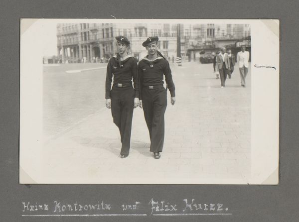 Curator: This gelatin silver print, entitled "Twee Wehrmachtsoldaten," meaning "Two Wehrmacht Soldiers," was captured in 1941 by Foto Atelier and now resides in the Rijksmuseum. The tonal range alone gives this image a very sombre feeling, would you agree? Editor: Absolutely, there’s a stark, unsettling quality to the grays, almost bleached in some areas. It contributes to the stiff posture of the two men walking down the cobblestone street; the backdrop of city buildings feels oppressive and adds to the mood of war hanging heavy in the air. I'd love to examine how that gelatine affected that specific tone! Curator: Notice how the composition guides the viewer’s eye directly to the soldiers, dominating the space; one in a peaked cap with visible wing insignia and the other in the side cap of the army uniform. Their uniforms and stern faces contribute to a powerful and rather chilling portrait. The architecture is not in focus so the subjects’ dominance is highlighted further by use of composition. Editor: Speaking of uniforms, I am thinking about the textiles and labor implied in producing them and even that cobblestone street! What kind of maintenance was needed for such large scale infrastructure for this image to even exist? The social networks and economy of war here, aren't explicitly present, but profoundly involved. Curator: Indeed. What I see reflected so strongly is the propaganda element of the era; but by focusing on these men, rather than a victorious image, what impact did the photographer want to have with this portrait of Nazi occupation? Was it supposed to embolden or invoke? Editor: That is certainly an interpretation worth considering. And looking closer, this photo atelier studio… their choice of gelatin silver as the printing material, I can't help wonder what sort of material constraints influenced its availability and the ease of mass-production required in a time of conflict. Curator: This detailed photograph reveals the structure of life during that difficult period, as well as highlights what a talented artist was able to express by harnessing compositional conventions. The photo provides the opportunity to appreciate that the maker utilized form to elicit deeper insight. Editor: By questioning these very material foundations, the physical and economic conditions enabling such images, we uncover much more regarding the complexities of representing historical narratives. It helps remind that even potent images can belie so many hidden histories within its own making.