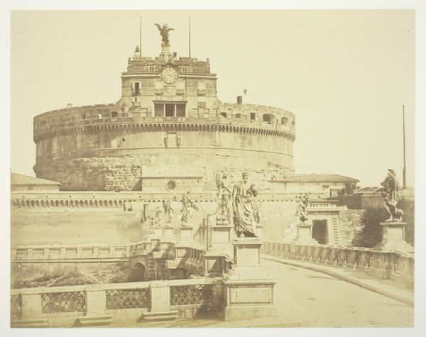 Curator: The atmosphere here is simply otherworldly; the gelatin silver print is bathed in sepia tones, and the textures give the Angel's castle and its adjacent bridge the feeling of having always existed. Editor: Let's contextualize. We are looking at an artwork called "Gezicht op de Engelenburcht in Rome" by J. Martin, who worked on it between 1845 and 1855. It's fascinating to consider what it meant to capture the city in those days of emerging photographic techniques. Curator: Indeed. It's striking to think about the amount of time that was spent perfecting the print quality on aged and toned paper, because this evokes the weight of history bearing down upon modernity. It also allows the eye to examine the meticulous construction process. The photographer is making more than a simple documentary photo. Editor: Absolutely, it feels less about simple architectural recording and more about framing Rome itself as a powerful cultural artifact, particularly given the bridge's multiple reconstructions and the Castle Sant'Angelo's repurposing through millennia. The question that stands out to me: Whose history and whose city are privileged within that construction? Curator: That's interesting, because photography—as a medium for mechanically reproduced images—began to challenge art’s role as the primary vehicle for commemorating events or people or places. The laborious process to craft gelatin silver prints during that period complicates the perception of the mechanical in photography. Editor: This photo sits interestingly at the intersection of both old and new media and highlights, to your point, its shifting function within society as a democratic visual archive of a growing populace that needed these photographs not only for the recording, preservation, and study of history, but also for leisure and scientific pursuit. I can see the historical context, but it's also an artwork to reflect upon. Curator: Well, what it brings to the fore for me is how deeply embedded craft practice remains in image production, even with technology that purports to make image-making effortless and objective. Editor: In the end, both the technical and social histories contribute to what the work makes visible—and what it obscures. It is powerful that the medium carries its own past with it.