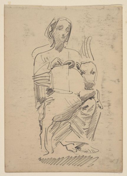 This pencil sketch, Kopi af den kronede Maria med Barnet, was made by Niels Larsen Stevns, we don't know when exactly, and it's a copy of the crowned Virgin Mary with Child. What strikes me is the urgency of the lines, how they swarm and cluster, particularly in the drapery of Mary's robes. It's like the artist is trying to capture something fleeting, a sense of volume and form with minimal means. The texture of the paper peeks through, lending a rawness to the image. You can almost feel the artist's hand moving across the page, searching for the right contours. Look at the way the halos are rendered, just simple circles, and the angels sketched in with the barest of lines. There's a beautiful economy to it all, a sense of paring down to the essential elements. Stevns reminds me a bit of someone like Emil Nolde, in his interest in religious subjects and his expressive use of line. But where Nolde goes for bold color, Stevns sticks to the humble pencil, finding a different kind of power in its simplicity. This piece celebrates the beauty of the unfinished, the potential that lies in the first marks on the page.