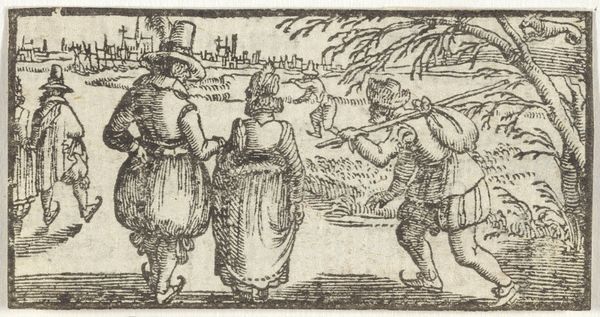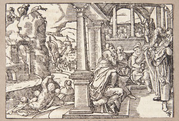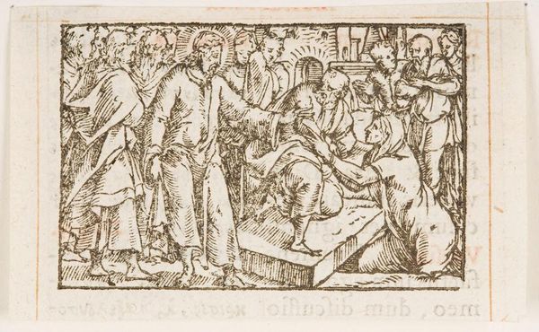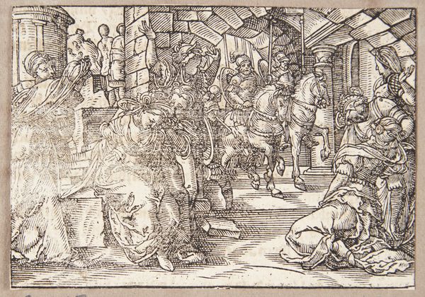 Tobias Stimmer’s woodcut, "Lucretia's Death," presents a dramatic scene rendered through the stark contrast of black lines on a white field. The composition is carefully structured, with the lifeless Lucretia at the center, surrounded by figures whose gestures emphasize the emotional weight of the moment. The artist employs hatching and cross-hatching to create depth and shadow. The linear quality of the medium, combined with the dynamic arrangement of the figures, draws attention to the narrative's intense emotionality. Here, line functions not just descriptively, but also expressively, guiding the viewer's eye and underscoring the tragedy. This aesthetic choice reflects the broader artistic concerns of the period, where printmaking served as a vital medium for disseminating stories. Stimmer’s work exemplifies how formal qualities of line, composition, and texture work together to communicate complex ideas about virtue, sacrifice, and the power of narrative. By focusing on the formal elements, we gain a deeper understanding of the cultural and philosophical implications of the work.