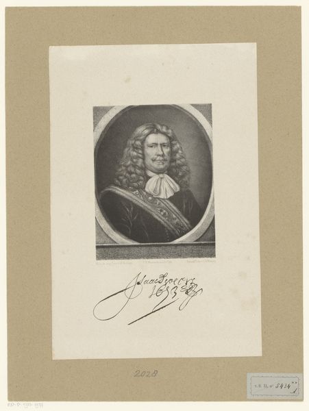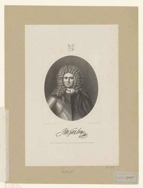 Editor: Here we have Frederik Hendrik Weissenbruch’s "Portret van Willem Bastiaansz Schepers," dating from around 1858 to 1862. It’s a print, and what strikes me immediately is the contrast between the ornate wig and armor and the somber expression. What do you see in this piece, considering its historical context? Curator: It’s more than just a portrait; it's a statement about power, identity, and historical memory. Consider the subject, Willem Bastiaansz Schepers. This portrait, rendered much later than Schepers' own lifetime, revives a figure from the Dutch Golden Age, a period often romanticized for its mercantile success and colonial endeavors. How might this idealized representation reinforce specific narratives about Dutch identity and its relationship to its colonial past? Editor: So, it’s less about accurately depicting the individual and more about… perpetuating a certain image? Curator: Precisely. The armor, the wig, even the cross—they're all symbols that evoke a specific kind of authority. We have to ask ourselves, whose authority is being validated here, and for what purpose? Does the artist's choice to portray him in this manner celebrate or perhaps subtly critique this figure in light of the legacies of colonialism and social inequality? Editor: It’s like the artist is engaging in a dialogue with history itself. Curator: Absolutely. We are invited to examine the ways in which history is constructed and how these constructions can both reflect and shape contemporary ideologies and power structures. It makes you wonder, who gets remembered and how? Editor: I hadn’t thought about it that way. It’s given me a lot to consider regarding the relationship between art, power, and historical narrative. Curator: And that's the power of engaging with art critically! It opens avenues to question the stories we tell ourselves about the past and, more importantly, about who we are today.