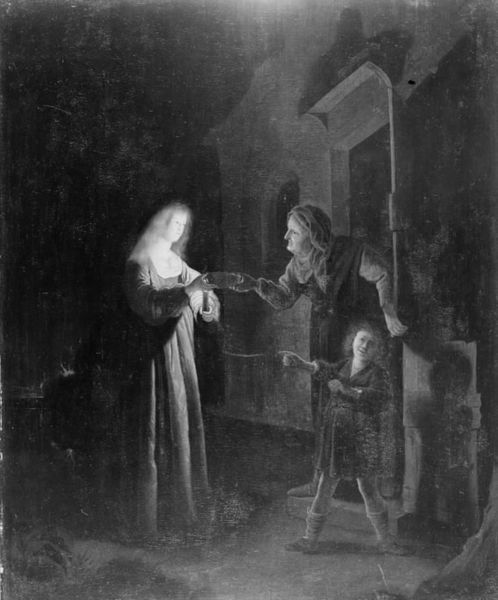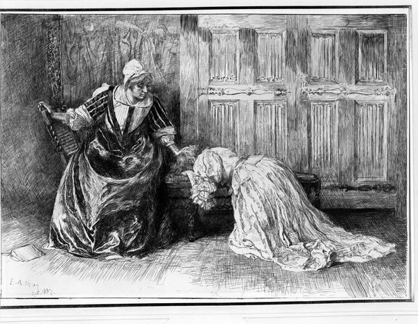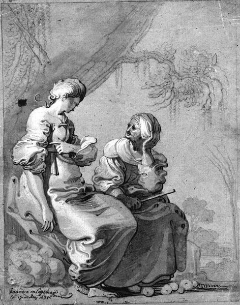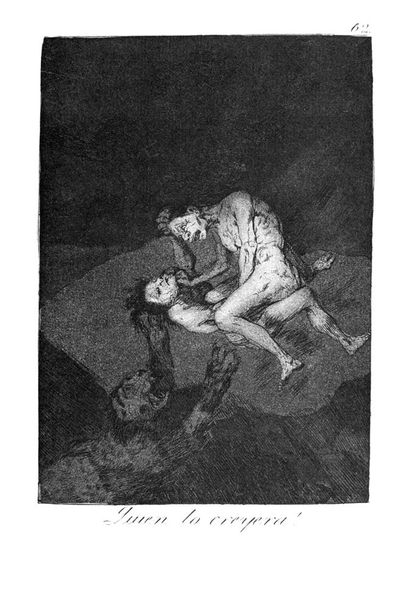 Curator: Alright, let’s look at Francisco de Goya’s unsettling print, "She is Well Pulled Down," dating back to 1799. It's an etching and aquatint from his 'Los Caprichos' series. My gut reaction? The overwhelming darkness pressing in on those two figures. What hits you? Editor: Definitely the stark contrast – the way the light clings to the younger woman, pulling at the stocking of the older one. Immediately I wonder about the material realities – the labor of textile production, the social layers revealed by even simple clothing. What story are these garments telling? Curator: That tug feels cruel, doesn't it? There's such stark intimacy there. Given Goya’s satirical eye, I read it as an allegory—perhaps youth exploiting age, or maybe a biting commentary on social decline and power imbalances. The series, overall, skewers pretty much every societal ill. Editor: Absolutely, but it's not just allegory, is it? Consider the aquatint process – the painstaking layering, the corrosive acid biting into the metal. The darkness isn't just symbolic; it’s literally etched into the plate. And consider the cost of paper, the printing press itself. All that to circulate these provocative images! Curator: A crucial point. Goya wasn’t just making pretty pictures. The prints were intended to be distributed, to stir debate. It speaks volumes, though, that even with those layers of reproducible material, we can feel this intensely personal feeling, the heavy dread he's known for. Editor: And it begs the question: How many hands touched this image before it reached us? The etcher, the printer, the distributors…Each leaves a trace. I am also really caught up in the making of those garments, like how much of women's life must be invested into the garments of others. It really captures a story of the hands making fabric into clothing. Curator: I’m fascinated, that the Romantic vision – for me the artist pouring emotions into it -- is very material itself. Without tools, without the means of circulation, there's not art. I would agree with you there, yes! Editor: Precisely. Looking closely, what we perceive as 'artistic genius' is interwoven with the material conditions that enabled Goya's vision. A poignant example of the interplay between idea and tangible object. Curator: I keep drifting back to the implied narrative of that darkness behind. Goya makes us feel the imbalance, a world teetering on something quite grim. It seems, there is so much weight to that shadow, more than two centuries after the thing was created! Editor: For me, the brilliance is Goya using something as seemingly straightforward as a piece of clothing to hint at such immense stories about society, making the consumption, and even this print itself a powerful thing.