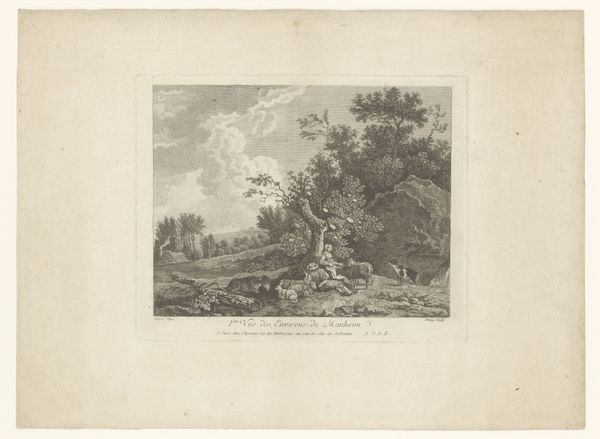 Editor: Here we have Jean Moyreau's "Eendenjacht," which translates to "Duck Hunt," a print made sometime between 1733 and 1762. The hazy, almost dreamlike quality of the scene strikes me. The composition guides my eye through the landscape to the hunters in the background. What do you see in this piece? Curator: I’m immediately drawn to the symbolism inherent in the act of hunting, particularly the representation of nature and humankind’s dominion over it. The subdued, almost melancholy tone suggests more than just a simple hunting scene. It evokes cultural memory around land use and status. Consider the dog—what does the breed suggest to you? Editor: I hadn’t considered the dog. Perhaps it signals the wealth and leisure associated with hunting as a sport, rather than a necessity? Curator: Precisely. The presence of specific animal breeds and hunting customs are powerful symbols within aristocratic culture. We must also remember the etymology of "landscape"—initially referring to a human-made administrative division. How might that affect our reading of the piece? Editor: That's a fascinating point! It makes me wonder about the boundaries being depicted – are they purely geographical, or are they also hinting at social and economic divides? Curator: Yes, the image becomes a carefully constructed stage for displaying power dynamics. Look at how the artist renders the cloudscape. What visual traditions might Moyreau be referencing with such evocative natural features? Editor: I think that viewing it in terms of symbolic gestures sheds light on how the seemingly pastoral scene has so much loaded social information packed in. Curator: Indeed, symbols speak across generations, embedding complex social information within images.