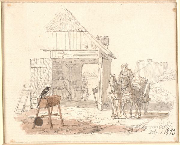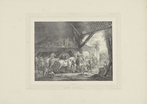 Editor: Here we have "Interior of a Stable," an undated drawing, potentially gouache or ink and etching, by Philip Wouverman. It feels like a snapshot of everyday life, almost like street photography but… for horses. What is your take? Curator: It’s fascinating to consider this image through the lens of genre painting and its connection to burgeoning Dutch national identity. Scenes of daily life gained prominence as the merchant class rose, keen to see their own world reflected in art. Editor: So, this isn’t just about horses then? Curator: Exactly. Consider the placement of the stable: not a grand palace, but a working space, teeming with everyday tasks. How does Wouverman’s choice of subject matter, and this almost casual realism, reflect broader societal values at the time? Editor: It does feel…democratic somehow. The light falls evenly, no one figure is the focus. Even the animals get attention! Is this lack of hierarchy significant? Curator: Precisely! Think about the intended audience. Wealthy merchants would purchase pieces such as this, viewing an idealized, perhaps romanticized, version of common life as their social status ascended. Does it tell us more about them than it does the stable workers? Editor: I see. So, while appearing straightforward, it's carefully constructed to appeal to a specific viewership with new social standing, subtly affirming their values. It makes you think about who art serves. Curator: Absolutely! The image, beyond its surface charm, highlights how art shapes, reflects, and potentially even reinforces social structures. Thank you for noticing this intriguing juxtaposition of art and cultural interpretation. Editor: And thank you! I hadn't considered it in the context of class and status. It gives it so much more depth.