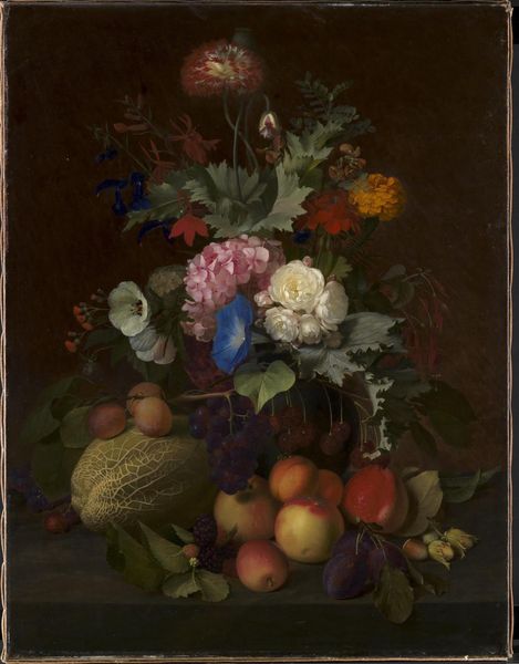 Curator: Let’s discuss Anthony Oberman’s "Still Life with Fruit in a Terracotta Dish," created around 1830, now residing here at the Rijksmuseum. Editor: Immediately, I notice the almost overflowing abundance—the composition teeters between controlled arrangement and the lushness of nature taking over. There’s something almost hedonistic about it, wouldn’t you agree? Curator: Absolutely, but within that supposed indulgence lies a potent commentary, or perhaps, celebration of global exchange and the burgeoning Dutch economy of the period. Think about it—each piece of fruit, likely imported, acting as a symbol of colonial enterprise and wealth accumulation. Editor: It's more than just commercial wealth, though, right? It's the weight these fruits and vessels carried culturally, historically. A terracotta dish would suggest earth, nourishment, domestic rituals…it speaks to me of a comforting timelessness. The grapes especially. Grapes have been symbolic of luxury and also sacrifice in religious paintings since Ancient Roman times. Curator: That is true, and if we consider the cultural politics, we can read those symbolic associations into its broader context. In a rising class system built upon exploited resources, representations of luxury can become very charged emblems of wealth, prestige, and inequality. Editor: Even in the arrangement of the light, it feels calculated, creating a drama. You see how the light catches some fruits just so, highlighting specific textures and contours while others remain shadowed, almost secretive. This evokes the dichotomy of access and denial in the socioeconomic strata. Curator: Yes, and notice the oil-paint, creating that highly-polished, almost seductive surface quality… it enhances this reading of consumerism and display. But consider how we might question the gender dynamics, and even who gets a place in such an economy. Were paintings like these only available to upper-class men? What happens to female artisans or people of color? Editor: Fascinating. Thinking through the symbolic weight—the grapes, the leaves—against the backdrop of wealth and the painting’s very materiality gives the image an entirely fresh potency. Curator: Indeed, the work provides us with endless opportunities to explore intersectional dynamics that affect who we are, where we come from, and what it all means to see something as ordinary as a bowl of fruit represented in art.