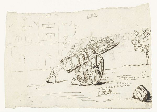 Curator: I find this unassuming pencil drawing by Johannes Tavenraat, created in 1839, deceptively captivating. It's titled "Zeilschepen aan een oever in Kleef," depicting sailboats along a bank in Kleef, Germany, and currently resides in the Rijksmuseum collection. Editor: There’s a distinct sense of quiet industry about it. It almost feels like looking at a charcoal rendering of shipbuilding on a misty morning; lots of blurred shapes and almost indistinct activity. Curator: Tavenraat’s choice of pencil underscores this atmosphere. The medium invites a raw, unvarnished glimpse into 19th-century riverside activities and society in Kleef, even documenting the technology of the era and labor practices around ship building. Editor: True, the hazy imprecision enhances its authenticity. But I’m drawn to the recurring images of the boats themselves: they serve as symbols of both trade and transition. What I perceive are vehicles, facilitating our journeys whether geographical or of the spirit. Curator: Fascinating interpretation, particularly given that, historically, the depicted river was central to commerce, politics and society along the Lower Rhine. I also can't help considering the societal role of artistic production here, how Tavenraat chose a practical landscape rather than a grandiose mythological tableau, really emphasizing everyday subject matter. Editor: But don’t those sailboats reach even beyond their literal function? The masts remind me of reaching towards enlightenment; the hulls embody security, safety. Consider mankind's age-old relationship with water—life, journey. I notice such traditional signs repeating endlessly, whether consciously inserted by Tavenraat or as the symbolic weight simply rises within the image itself. Curator: Well said. And the composition—focusing on a liminal space between the boats, their repair, their role in local culture— speaks volumes about transition. This unpretentious work does quietly illuminate both the tangible and symbolic landscapes of its era, providing great information about social life at the time, as well as deeper resonances in cultural memory. Editor: Precisely; Tavenraat offers, if subtly, an echo of ourselves even across vast divides of time.