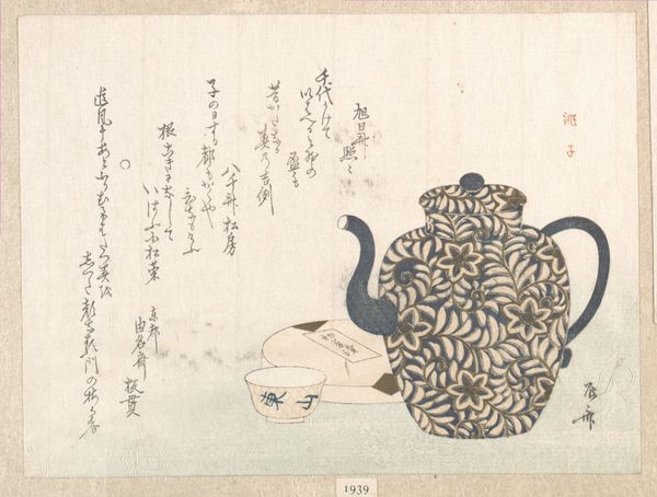 Kubo Shunman created this woodblock print, "Shimadai and Sambo," in Japan, probably in the late eighteenth or early nineteenth century. The print depicts an elegant bonsai arrangement of pine, bamboo and plum, atop a highly stylized table. Beside it, a tray-topped stand holds a stone and a cloth, perhaps alluding to the tea ceremony. While seemingly a simple still life, the image speaks volumes about the culture of its time. Consider the rising merchant class of the Edo period, eager to emulate the refined tastes of the aristocracy. Objects like this print and the bonsai it depicts were likely status symbols, and the inscription, untranslated, hints at literary connections and classical learning. The print’s composition, with its flattened perspective and delicate lines, reflects the influence of Chinese art, itself a marker of cultural sophistication. To truly understand this artwork, we need to explore the social history of Edo-period Japan. Museum archives, historical texts, and studies of material culture would allow us to unlock the complex web of meanings embedded within this seemingly simple image.