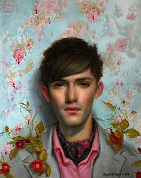 Rose Freymuth-Frazier created this oil on canvas, "Ruby Throated Lover." The artwork immerses us in a vibrant field of colour, where a young man is nestled amidst climbing roses and hovering hummingbirds against a baby blue backdrop. The use of red and green creates a visually stimulating composition that interweaves the natural world with human representation. Notice how Freymuth-Frazier uses a blend of sharp realism and soft abstraction, especially in rendering the man's features versus the more diffuse treatment of the surrounding flora and fauna. The hummingbirds, which are often symbols of energy and vitality, enhance the theme of nature's embrace. This technique is reminiscent of Symbolist artists who sought to evoke emotional and spiritual states through symbolic imagery. By blurring the lines between the portrait and its setting, Freymuth-Frazier suggests a deeper connection between the individual and the environment, inviting us to consider how our identities are intertwined with the natural world.