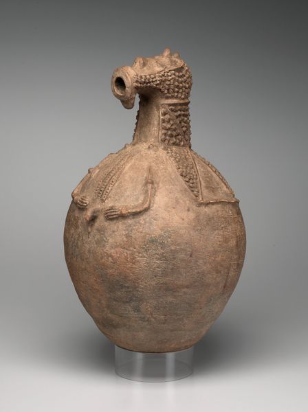 Curator: Looking at this earthenware sculpture of a vulture, dating roughly from 201 to 700, and attributed to the Colima culture, I’m struck by its material presence, and by the cultural values it embodied. Editor: It’s so simple and grounded. I’m immediately drawn to its stillness. It almost seems like it’s caught in a moment of quiet contemplation before taking flight. It's more squat than majestic. Curator: Vultures held a complex symbolic weight in many Mesoamerican cultures. Beyond their role as scavengers, linked to purification and renewal, they are also connected with ideas about transitions and intermediaries between different realms. Its role in a ritual context shouldn't be discounted either, probably as funerary object. Editor: Exactly. Seeing a vulture modeled in such a stylized manner underscores how perceptions of these birds can really vary, doesn't it? I wonder how different social or environmental factors impacted the vulture's reputation throughout the Americas? This simplified representation, almost cartoonish, does somewhat sanitize the natural roles it has. Curator: That tension, between the representation and the real animal, highlights a key aspect of Indigenous art and its cultural function. Rather than creating a perfect copy of nature, Colima artisans selected, emphasized, and sometimes even abstracted elements for deeper meaning. What we see represented reveals more about the cultural significance to that society. Editor: Yes, absolutely. What makes this so engaging for me is realizing how Colima artists took this creature of often negative association and created a vessel of striking power, and subtle design. What do you think its lasting power says about art's role in reframing our fears and fixations? Curator: Precisely. It goes beyond merely representing; it is shaping our emotional and cultural memories, and continually renewing meanings associated with such important symbols. The cultural meanings and implications are continually transformed over time and context. Editor: And isn't it fascinating to consider how those shifting meanings impact our own experience of viewing this sculpture now, across all those cultural and temporal distances? Curator: It invites an emotional response, a sense of connection that transcends its historical and cultural distance. It invites continued reflection.