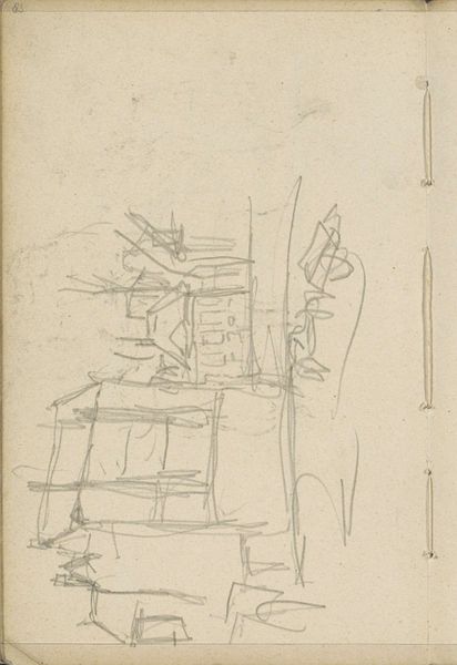 Editor: This pencil drawing, "Gezicht op de Nieuwe Teertuinen en Prinseneiland te Amsterdam" by George Hendrik Breitner, likely from around 1907 to 1911, captures a cityscape with an unfinished quality. The loose lines create a sense of movement and almost feel like a fleeting glimpse of a scene. What do you see in this piece, particularly focusing on its formal elements? Curator: This work, viewed through a formalist lens, immediately draws attention to its inherent structural qualities. The composition is defined by a dynamic interplay of vertical and horizontal lines, creating a visual scaffolding upon which the scene is built. Note the layering of the forms and the stark contrast between the heavily worked areas and the blank paper surrounding them. These stark areas aren't merely voids; rather, they operate as critical structural elements that allow us to perceive the figure. How does the medium--simple pencil--contribute to your understanding? Editor: It lends it an ephemeral feel. Like it's quickly jotted down, as if he captured it then and there, like a snapshot. Is there something significant about the rough texture in it? Curator: Indeed. The texture created by the pencil on paper adds depth and nuance, which is very different to other drawing methods, say, charcoal. The lack of shading further emphasizes line and shape over volume and mass, highlighting the flatness of the picture plane. Do you observe the various depths achieved and how they contribute to an illusionistic space despite its flatness? Editor: Yes. Although it's a fairly simple drawing, there are suggestions of near and far which allow one to consider relative depth, through contrasts. I see a tension between the drawing's surface and spatial representation. Curator: Precisely! This is not simply a realistic representation but an engagement with form, space, and line, making it very compelling when considered this way. Thank you! Editor: It helps reveal how we actively construct reality, more than merely seeing it. This conversation gave me so much to think about.