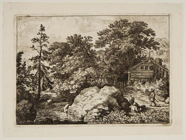 Editor: This is Jean Louis de Marne’s "Landscape with Bridge," a print from the late 18th or early 19th century. It feels like a constructed pastoral scene, almost staged. What social dynamics might be at play in its depiction of rural life? Curator: It's interesting you pick up on the "staged" quality. Consider the period. The French aristocracy often romanticized rural life while actively exploiting it. How does de Marne's composition potentially participate in or critique this dynamic? Editor: So, the idyllic scene might mask underlying power imbalances? Curator: Precisely. Look at the figures, their scale and placement. Are they truly integrated into the landscape or are they performing a role within it, for a presumably elite viewer? Editor: I hadn't thought about that; it changes how I see the whole scene. Thanks!