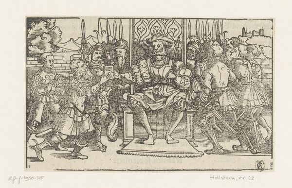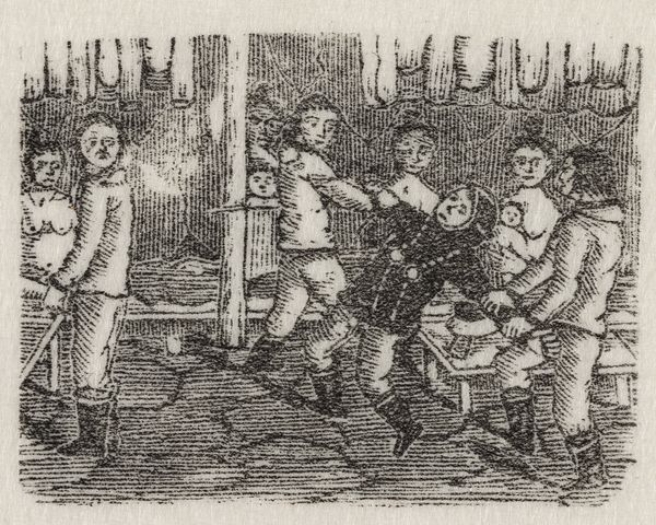 Editor: Here we see a lively little sketch by an artist from the British School, its title unknown. There's a man carrying a woman, and the scene feels quite chaotic and a bit mischievous. What’s your read on this? Curator: Mischievous is a good word for it! It feels like a stolen moment, doesn't it? A secret rendezvous perhaps? The figures are so wonderfully exaggerated, almost cartoonish. I wonder if it's a social commentary, poking fun at the elite. And the way the artist uses line… it's so energetic! What do you make of the expressions on the faces? Editor: They definitely add to the sense of intrigue, everyone seems to be in on the joke! It makes you wonder what the story is behind it all. Curator: Absolutely! It's a snapshot of a world teeming with life and, dare I say, a bit of scandal. Makes you want to write its narrative, doesn’t it? Editor: It certainly does! I’ll be pondering the story behind this one for a while.
