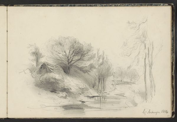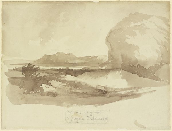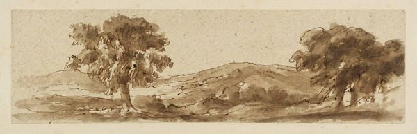 Here we see "Hilly Landscape with Trees," a small ink wash on paper by William Hart. The landscape is rendered in monochrome, focusing attention on the sinuous lines and layered washes that construct the scene. Notice how the trees on the left aren't merely depicted, but built through an accumulation of strokes, creating volume and texture. The land slopes down into a flat plane of darker ink, suggesting a pool or marsh, dividing the foreground from distant hills. Hart's technique invites us to consider the structural elements of landscape painting itself. The composition, though seemingly traditional, uses the stark contrast between light washes and dark, decisive lines to create a dynamic visual field. This isn't just a landscape; it is an exploration of form, where each stroke contributes to a larger spatial and atmospheric construction. The scene offers a moment to reflect on how simple means can evoke the complexities of the natural world.