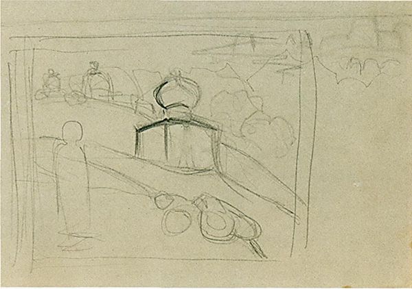 Karl Wiener made this drawing, "Flucht aus der Zeit," or "Escape from Time," in 1943 using graphite on paper. It's all about the energy of the lines, right? How they collide and intersect, creating this sense of fractured space, like shards of glass reflecting different realities. Look at how he layers the lines, some dark and assertive, others light and tentative, almost like whispers. The graphite is applied with varying pressure, creating a range of tones from deep shadows to soft highlights. See that soldier's face, how it emerges from the chaotic web of lines? The eyes, especially, are so intense, conveying a sense of weariness or maybe even a kind of resignation. It's like he's trapped, not just in the drawing, but in some kind of psychic prison. I think of Paul Klee when I look at this, that same interest in line as a way to map inner states. Both artists embrace ambiguity, inviting us to wander through the image and find our own meaning in the chaos.