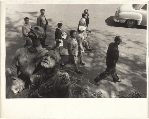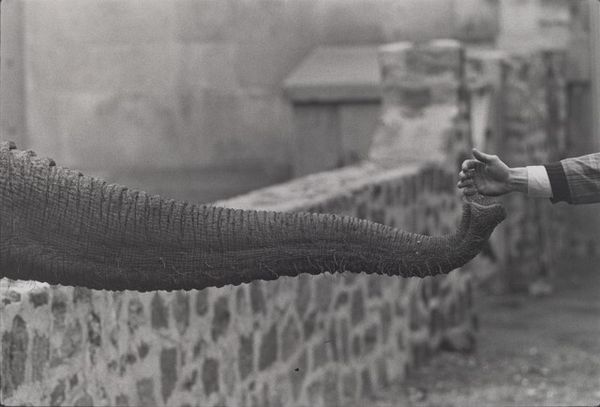 Bill Dane's photograph, Oakland (Kneeing elephant), shows an elephant kneeling on a city street somewhere in Oakland. Dane is known for his snapshot aesthetic and use of black and white film, turning everyday scenes into poetic and poignant moments. There's a tenderness in the grey tones, softening the grit of the urban setting. Look at the texture of the elephant's skin, so wrinkly and creased it looks almost like a map. The quality of light and shadow gives the picture a tactile, almost sculptural, feel. Notice the details – the drain cover in the bottom left, the shopping cart filled with goods in the foreground. They are everyday objects, and seem to be placed in direct contrast to the otherworldly image of an elephant in an urban environment. This piece reminds me of some of the surrealist juxtapositions that pop up in paintings by artists like Magritte. It's a strange, dreamlike image that raises more questions than answers.