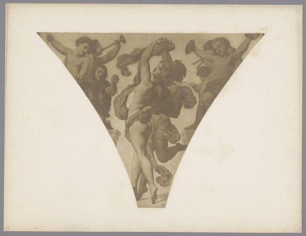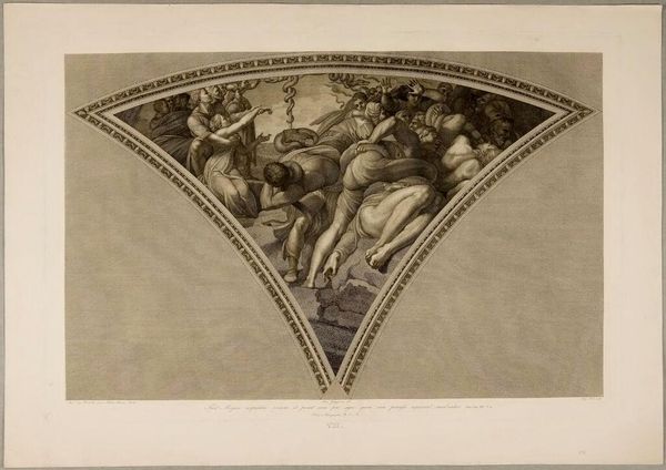 This engraving, depicting the Evangelist Matthew amidst clouds and angels, was created by Jean Louis Roullet in the late 17th century. The composition immediately strikes you with its dramatic use of form. The triangular shape echoes the architectural space it likely adorned, creating a harmonious blend of art and structure. Notice how Roullet employs a hierarchy of scale, positioning Matthew centrally and larger than the surrounding figures. This emphasizes his importance, while the swirling clouds and dynamic poses of the angels infuse the scene with movement and a sense of divine energy. The fine lines and detailed shading, achieved through the engraving process, add depth and texture, further animating the scene. The use of light and shadow here isn't merely decorative; it's a structural element that guides the viewer's eye and reinforces the theological narrative. The play between earthly and divine realms, rendered through form and composition, invites us to consider the broader cultural discourse on religion and representation during Roullet's time.