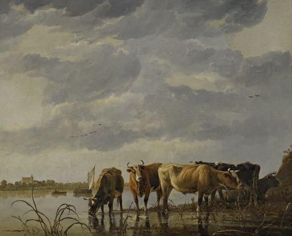 Editor: This is “Horses in a Rainstorm” by Károly Lotz, and the medium looks like possibly oil on canvas. There is something heavy about the atmosphere, like the air itself is weighted down by the storm. What are your first thoughts on this artwork? Curator: Immediately, I’m struck by the means of production evident in this scene. The painting shows us not just horses, but the infrastructure that supports their existence: the well providing water, the open land offering grazing. It raises questions about labor and resource management in a rural economy. How reliant are these horses to humans, based on the materials presented here? Editor: I see what you mean! The well and the herder really drive home the dependency of both humans and animals on each other, as well as natural resources. Curator: Exactly. And what about the paint itself? The way Lotz layers the pigment, especially in the sky, shows an interesting tension. We have areas of great depth and blending but the way he captures those cumulous clouds must require massive labor, or did he develop specific faster process to produce a seemingly detailed scene? Editor: That's an interesting point. Now that I look closer, the application of the paint is less about perfect realism and more about capturing a sense of immediacy and perhaps raw labor that would be needed to produce the materials necessary for this setting, almost an “in-the-moment” feeling that also comes with a downpour. Curator: Indeed. And in his choice of this rural scene rather than, say, a portrait of nobility, does Lotz comment on the relative value of different types of labor? The social context really informs how we value art like this today. What do you make of it now? Editor: I did not quite catch the value in production. I learned a lot about social context. Thanks! Curator: Me too, every time!