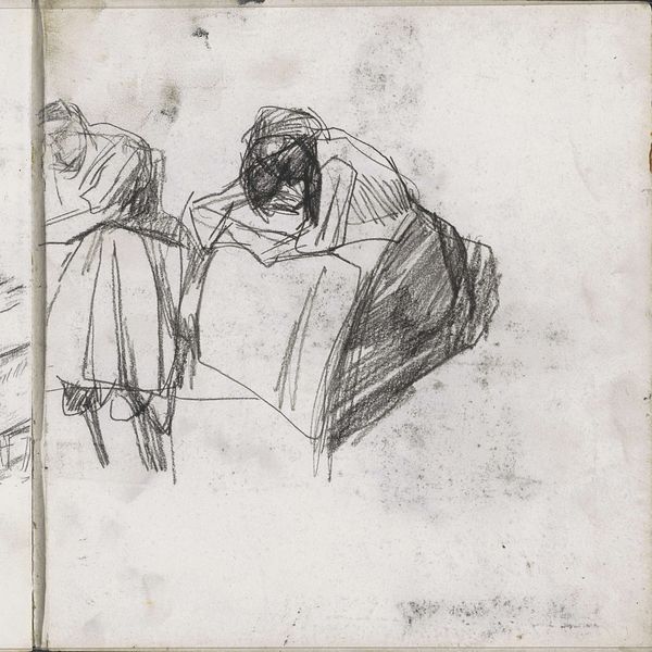 Carel Adolph Lion Cachet sketched "Drie lezende figuren" with a graphite pencil, creating a composition that feels both intimate and fragmented. The figures are presented in a confined space, delineated by stark, vertical and horizontal lines that suggest a room or enclosure. The artist used a minimal amount of lines to define shapes, creating an unfinished quality that invites the viewer to actively piece together the scene. The faces of the figures are only summarily indicated, as such, they do not invite us to consider their individual emotional states, but the state of reading itself. The visible texture of the sketch marks on the paper contrasts with the implied smoothness of the figures' forms. This juxtaposition draws attention to the materiality of the drawing itself, reminding us that we are looking at lines on a surface. The dog's faint, almost ethereal appearance suggests an ambiguous relationship to the space, as if it exists on a different plane of reality. Through this arrangement, Cachet destabilizes traditional notions of space and representation.