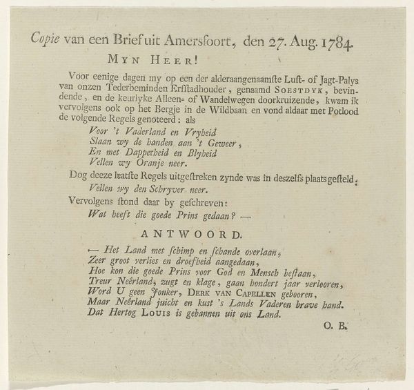 Curator: This intriguing printed piece is entitled "Antwoord van Pieter Dwars-Doelen, scheepstimmerman op de werf Vrijheid en Eendracht, aan den vermaarde schryver van de Aanspraak," dating from 1780. It is a print on paper, characteristic of the Dutch Golden Age's typography. Editor: Ah, so it’s a printed response. My immediate impression is… restrained fury. The text is packed onto the page like tightly coiled rope. You sense there’s passion boiling just beneath that very orderly surface. Curator: That coiled energy probably arises from its socio-political moment. The pamphlet wars of the late 18th century involved responses to philosophical, economic, and ultimately political issues. Its material form reflects this contentious discourse through widespread print. Editor: True, I am very interested in the material. How does this broadside relate to the actual labor of Pieter Dwars-Doelen, the shipbuilder. Were pamphlets commonly read amongst workers in the shipyard? Curator: The context suggests it certainly would. The very naming of the shipyard “Vrijheid en Eendracht”, or "Freedom and Unity", directly hints at republican values fermenting. Consider this less about "high art" and more about accessing emerging discourses regarding social contract theory that was circulating even within Dutch artisanal trades. Editor: A direct line from shipyard to societal discourse, quite literally! Yet it is not embellished, visually spare as though words were crafted for maximum force—more manifesto than visual art. And I feel the material – the paper itself -- adds to the fragility. It conveys immediacy and urgency, as though waiting would have rendered the message irrelevant. Curator: That fragility underscores your perception. Unlike durable oil paintings, printed pamphlets like these were ephemeral, often disposed after reading. But this ephemerality allowed a widespread distribution and thus amplified socio-political engagement from all sectors. Editor: It's funny to consider ephemerality as empowerment. A potent thing, a single printed response from a craftsman, resonating even now across time. A material artifact buzzing with discourse from below, demanding attention. Curator: Yes, exactly. From examining process to reflecting upon social and material contexts, hopefully, our approach brings new attention to such overlooked yet deeply resonating material of history.