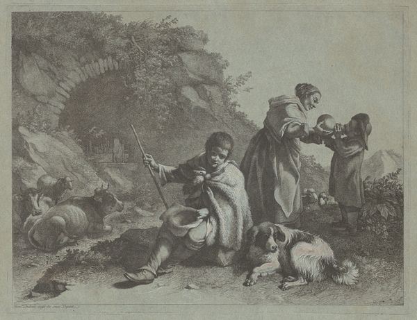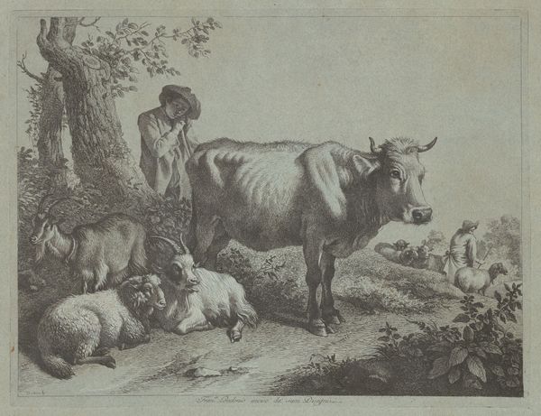 Curator: Here we have Francesco Londonio’s 1763 print, "Shepherd with a Sack Driving a Flock." A pastoral scene, of course, with a shepherd guiding his sheep to water. What strikes you first? Editor: Immediately, I'm noticing the paper itself and the incredible detail achieved through the printmaking process. It gives the entire composition a gentle, almost dreamy texture. Look at how the sheep seem to blur slightly at the edges. What sort of social structure was this capturing, if anything? Curator: Shepherd and flock are recurrent motifs within religious allegory, reaching back into ancient near eastern imagery of kingship, the shepherd’s crook indicating governance but also pastoral care, as in Psalm 23 "The Lord is my Shepherd.” Editor: I hadn't thought of the biblical symbolism so overt here. To me, though, it’s speaking volumes about the rural economy of the time. How commonplace would an image like this have been and the working conditions? Was this the luxury market for prints? Or mass production to communicate value and wealth, by way of livestock? Curator: The circulation of images would likely have been aimed at those familiar with country life. We can see Londonio wasn’t necessarily celebrating backbreaking toil but appealing to romantic notions already present. Even then, rural life was being idealized for wider audiences. Editor: And let’s not forget the physical act of creating this image. Think of the tools, the skill required to transfer that vision onto a plate. What type of printmaking are we considering? That will explain the nature of labor and potential industry for it. Was it etching? Or engraving? These factors help us unpack more material context. Curator: It invites contemplation beyond a simple surface impression. This image serves not just as a pretty picture but as a carrier of complex, even ancient ideas. The shepherd is not simply minding sheep but embodying principles of governance, perhaps the idealised responsibilities that wealth ought to shoulder within its community. Editor: Well, on my end, it prompts a fascination with production: the way images participate in circulating commodities in culture and how they come to solidify our views about class and wealth. It’s a quiet pastoral scene, but it certainly asks big questions!