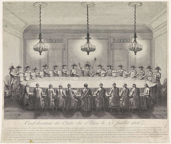 Editor: This engraving, “Audiens ved det russiske hof” or “Audience at the Russian Court” from 1647, depicts a formal gathering. I’m struck by how the repetitive figures and the rigid architectural setting create a sense of immense formality. What symbolic significance might lie within this composition? Curator: Indeed. Look at the placement of the figures and their headwear; each element contributes to a powerful, perhaps unsettling visual language. These towering hats are not just fashion. Think of them as markers of status and power, visually amplifying the wearers and emphasizing their position in the hierarchy. It echoes how we still use symbols to quickly grasp complex social relationships. Does the uniformity strike you as being in conflict with the clear presence of a ruler? Editor: Yes, that tension is interesting! The uniformity emphasizes the collective power structure, but then the Tsar is elevated, quite literally, on a throne. It's almost as if the print is both celebrating and subtly questioning authority. Curator: Precisely. Consider, too, the cityscape visible through the windows. The outside world is there, but completely separate from this contained, highly structured interior. What does this separation tell you? Editor: Maybe it's suggesting the closed-off nature of the court, detached from the realities of everyday life outside the palace walls? I hadn't thought about that before. Curator: Reflecting on visual elements such as architecture or fashion helps unveil the cultural memory contained within images like this one. Even after centuries. Editor: I see how carefully considering the symbolic language used here can provide deep insights into the artwork's meaning, far beyond just the historical event. Thanks!