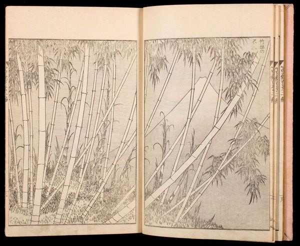 Editor: Here we have a page from Hokusai's Manga, specifically volume four. This one pictures trees and foliage, and the composition feels very serene. What do you see in this piece? Curator: The moon is a significant symbol here. Its fullness often represents enlightenment or a moment of heightened awareness in Japanese art. The trees are not merely decorative, they are imbued with longevity and steadfastness. What feelings do these objects evoke in you? Editor: I see that, it makes the scene feel very still and meditative. It makes you feel that time stops. Curator: Exactly! The stillness is precisely what Hokusai captures. It speaks to a deep connection with nature and the cyclical nature of life itself, a theme very important for the artist. Editor: That’s fascinating, I'll definitely look at Hokusai with a new perspective. Curator: Likewise, your insights add another layer to my understanding of Hokusai's work.