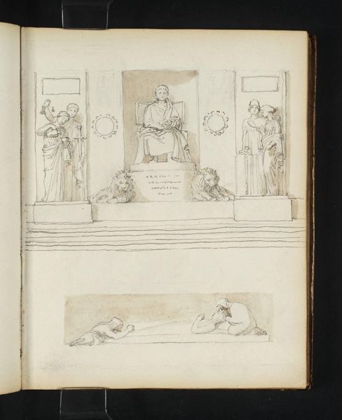 Curator: This sketch, by John Flaxman, held at the Tate, presents a study of funerary monuments. Editor: It's a study in grief, really. Stark, almost desolate. The line work is so sparse, yet it conveys so much. Curator: Precisely. Note the classical restraint in the composition, the figures rendered with a Neoclassical sensibility. Flaxman’s use of line dictates form. Editor: And the way those figures are laid out, almost architecturally. It’s like grief made geometric. I find myself drawn to the tenderness in the central figures. Curator: A striking contrast to the surrounding funerary architecture, wouldn’t you agree? Editor: It makes you think about how we memorialize loss, doesn't it? It's a thoughtful, touching study. Curator: A testament to Flaxman's ability to capture emotion through form and line. Editor: Yes, quite. Grief captured in pencil.