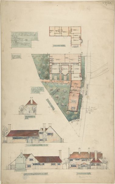 Editor: Here we have Charles Edward Mallows's "Design for Thatched Cottages for Mrs. Kingsley" from 1910, a pencil drawing and print. It feels so precise, almost like a secret blueprint for a storybook dwelling. I’m struck by its delicate lines and the warm, inviting quality, even though it's just a plan. What draws your eye when you look at this, particularly knowing the Arts and Crafts context? Curator: You're spot on – it *is* inviting! It whispers of handmade charm and a rejection of industrial coldness, a hallmark of the Arts and Crafts movement. Mallows isn't just drafting; he’s composing a dream. The perspective sketches at the top show that he's designing for lived experience as much as architectural principles. Those thatched roofs...they look like eyebrows giving character to each cottage. Editor: Eyebrows, I love that! But the floor plan at the bottom seems so functional, almost at odds with the whimsical sketches above. Curator: Ah, but even in that plan, there's a devotion to detail that elevates it. Notice how the rooms are arranged to maximize light and flow. Consider that the design, for Mrs. Kingsley, must mirror her sensibility. This drawing suggests something more: the Arts and Crafts ethos—functional objects crafted with art. Mallows creates an opportunity to dream for those who inhabit that residence and for us. I wonder if he wanted to invite a quiet moment of consideration from us... do you notice any aspect like this that I missed? Editor: The interconnectedness! There aren’t huge barriers between rooms. Everything appears fluid. You’ve made me see beyond just the facade and notice the philosophical intent. It feels a little like I peeked behind the curtain. Curator: And hopefully, caught a glimpse of the artist's soul, as well! I think both dreams were for someone's present, and somewhere in Mallows's heart, also a potential legacy for someone in the future.
