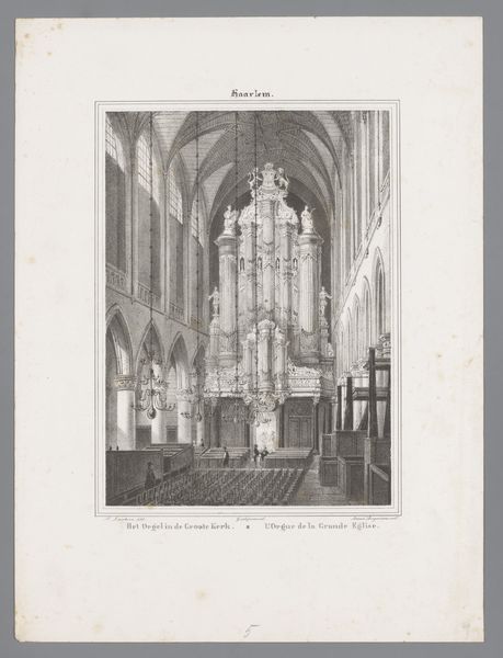 Curator: Let’s take a moment to look at this engraving, titled "Interieur van de Sint-Lievensmonsterkerk te Zierikzee, vóór de brand van 1832," dating from 1834. The image depicts the interior of a grand church before a significant fire. Editor: My first impression is one of cavernous silence. The architectural rendering emphasizes verticality through its columns and the reaching arches. The subdued greyscale palette adds to this atmosphere of hushed reverence and melancholy. Curator: Indeed. Contextually, this artwork gains potency. Zierikzee was, and remains, a city with significant social stratification, and of course the church was the heart of the town. This image becomes a record of what was lost—but also a signifier of enduring social hierarchies literally built into the landscape. Editor: I agree. Structurally, the artist employed a rigorous perspective, drawing our eye toward the altar, with its prominent organ. There is an incredible handling of light and shadow, creating a dramatic contrast and guiding the viewer’s gaze throughout the architectural space. The geometry is impeccable. Curator: And it's fascinating to consider how the artist renders a place of spiritual solace through the language of Neoclassicism—a style often associated with secular power and rationalism. The grand scale would’ve had significant implications for different social classes and their positions of visibility within the community and faith. Editor: The level of detail in the columns and vaulted ceilings is really amazing for the time. Each structural element, reduced to precise line work, builds into a layered interplay between positive and negative space. It seems to encapsulate more than the eye is led to see at first. Curator: Looking closely, we are also presented with the architectural depiction through the print, revealing details about materials, aesthetics, and space, prompting critical thoughts about social divisions and architectural intent during its construction and, indeed, now. Editor: Analyzing this architectural presentation using engravings unveils complex arrangements of forms and light and invites continuous optical scrutiny and appreciation for geometry, perspective, and the artistic hand, ultimately reflecting our minds.