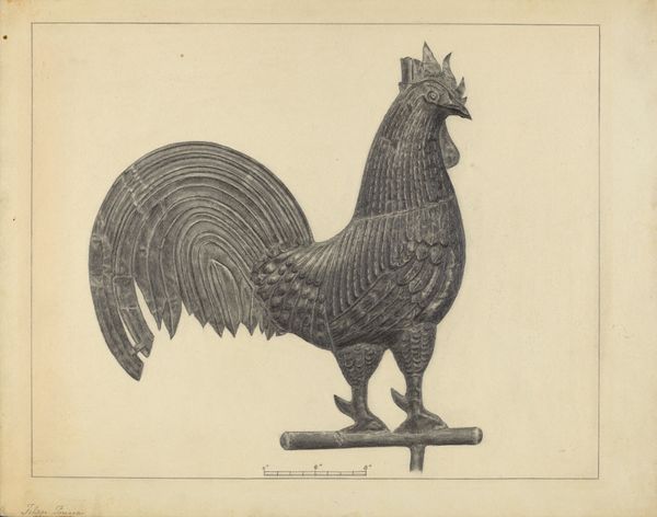 Curator: Frank Budash rendered this Pa. German Toy Rooster in 1939, showcasing folk art with both drawing and watercolor. Editor: There’s a grounded warmth about this piece. The monochrome presentation brings focus to the form and, surprisingly, softens what would otherwise be a boastful subject. Curator: Indeed. Consider the careful layering of pigment to simulate the light playing across the wood’s texture. The meticulous delineation—see how each groove articulates volume, constructing depth via subtle gradations? The composition reinforces the stability. Editor: Beyond technique, this rooster is packed with cultural memory. The Pennsylvania Dutch—or German—rooster became symbolic through folk art. What seems like mere decor also signals fertility, vigilance, a link to rural tradition, and an assertion of cultural identity, particularly against assimilation. Curator: Precisely. The rooster is coded through careful formal application. One cannot help but appreciate how lines become indicators for shape and structure in the rooster’s body and stylized tail feathers, while light and shadows coalesce into spatial harmony. It embodies pure form as signifier. Editor: Absolutely. One reads not just lines and tones, but deeper heritage through form. The object becomes more than just the artwork but a potent signifier for values that settlers from the Rhine held central in the New World. The simplicity gives its staying power across eras and diasporas. Curator: Understanding how a seemingly modest, handmade object transcends time demonstrates that less can indeed reveal much more. The interplay of materials creates potent forms which transmit enduring meaning. Editor: To encounter in the humble form is the potent resonance of culture and survival – encoded in a barnyard animal rendered with watercolor and careful line work. It has me seeing the piece in an entirely new light.