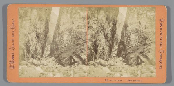 This stereograph, "Ole Bull's Concert Room" by Chas. Waldack, presents twin images that merge into a single, three-dimensional scene. The deep blacks of the cave walls contrast sharply with the highlights on the rough-hewn rocks, creating a dramatic play of light and shadow. The composition is structured by the diagonal thrust of the rocks leading the eye into the cavernous space. The stereoscopic effect heightens the sense of depth, inviting us to visually enter the subterranean world. This manipulation of perspective and form isn’t just representational; it serves to destabilize our perception of space, questioning the very act of seeing. The use of magnesium light, an early photographic technique, adds to the image's stark contrast. In the context of its time, such a stereograph not only captured a physical space but also engaged with broader philosophical notions about perception, technology, and the human experience of the natural world. This photograph challenges our understanding of space, reminding us that meaning is constructed through our interaction with the artwork.