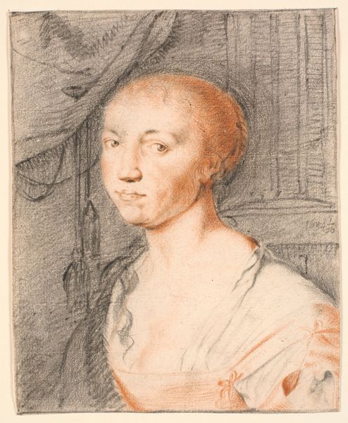 A. Weenix created this portrait of Siewert van der Meulen's wife in an unknown year using sanguine chalk. The drawing presents a study in contrasts between the detailed facial features and the more loosely sketched background elements. The subject's face is rendered with a delicate precision, capturing a soft expression through subtle gradations of light and shadow. In contrast, the drapery and surrounding foliage are suggested with rapid, gestural strokes. The urn to the right acts as a formal counterpoint to the figure, balancing the composition. This contrast destabilizes the traditional hierarchy within portraiture, where meticulous detail was reserved for the sitter's likeness. Instead, Weenix integrates the background as an active component, blurring the boundary between subject and setting. The interplay between precise form and expressive line invites us to consider how meaning is constructed not just through representation, but also through the materiality of the medium itself.