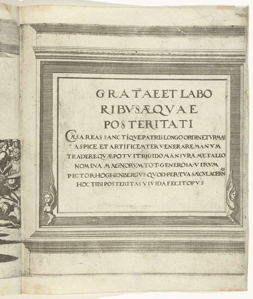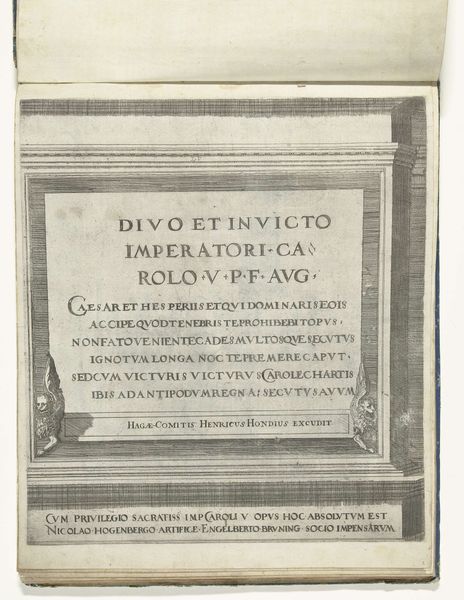 Editor: This engraving, "Blad met de opdracht aan Karel V, opdracht" by Nicolaas Hogenberg, created sometime between 1530 and 1536... it feels so formal, almost like a contract or a decree. The crisp lines and dense text really give it a serious tone. What can you tell me about the imagery at play here? Curator: It's fascinating how the weight of those historical documents still presses upon us, isn’t it? Consider the visual language used. Notice the classical architectural frame surrounding the text? That immediately invokes a sense of Roman authority and permanence. It's not just a message; it's intended to appear as something timeless, unwavering. Look to the left: what figures do you see? How might these images be working to legitimize Charles V? Editor: I see soldiers. So, it connects his power with military might? Curator: Precisely. It’s reinforcing the idea of Charles V as a divinely appointed and militarily powerful leader, one destined to rule, overcoming any obstacles. Note how the inscription is in Latin. Latin at that time was still associated with law, scholarship, and empire, imbuing the message with layers of cultural and historical resonance. Why would Hogenberg choose to create this as a print, do you think? Editor: Because prints allow you to make multiple copies! It makes the message way more accessible and able to spread widely. I guess it would really cement Charles V's image across the land. Curator: Exactly. This wasn't just about informing, but about shaping public perception and securing his legacy for centuries to come. See how the images reinforce the message and vice versa? Editor: I never considered how every part of an image reinforces an idea, from composition to text! The level of deliberate thought is intense.