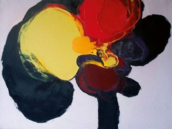 Curator: Here we have "Figure and Flowers," an oil painting attributed to Charles Blackman. It immediately strikes me with a sense of quietude. The muted palette and simplified forms evoke a dreamlike state, don't you think? Editor: The first thing that I notice is that incredibly dense impasto around those flowers! You can practically feel the texture and weight of the paint itself. Was Blackman trying to push oil paint to its sculptural limits here? It certainly deviates from purely representational concerns. Curator: Interesting perspective! I'm particularly drawn to the relationship between the figure and the floral arrangement. The figure, rendered in an almost monolithic blue, stands in profile, gazing intently at the vibrant bouquet. The contrast creates a dynamic tension. The juxtaposition, I believe, alludes to the nature of observation and subjective appreciation, a kind of meta-commentary. Editor: Well, let's consider how those vibrant flowers are made. Looking closely, the thick application isn't uniform—areas of heavier build-up imply repetition, almost rhythmic action from the artist. Given that the paintings are undated, understanding Blackman's method of applying this paint tells us something essential about how and when he made this piece. The blooms, by contrast, aren’t simply "observed" they’re intensely materialized! Curator: You raise an important point regarding method. But I remain captivated by how the abstraction allows the observer a wide interpretive space. One can explore themes like the fragility of beauty, the ephemerality of life itself, and the interplay of presence and absence. Editor: For me, that raw, visible making is less about “beauty” and more a testament to the labour—both the painter's labour and, of course, the implied labour involved in cultivating the flowers themselves, bringing to mind a social, historical context beyond mere “appreciation." Curator: Yes, the visible process of making—the impasto and visible brushstrokes—become powerful signifiers, as if what he wants you to understand is a state of perception beyond visual reality, and, really, feeling over fact. Editor: In essence, it reminds me to look more carefully at the art in front of me rather than immediately assigning cultural meaning, which would risk missing the material underpinnings of that significance.