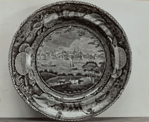 Editor: Here we have Helmut Hiatt's "Platter - 'Lake George,'" crafted around 1936 from earthenware and charcoal. It's such a striking combination – a landscape drawing, seemingly transferred onto a functional ceramic object. It really makes you consider its purpose; it's decorative art, yes, but the landscape makes it feel like something more. What strikes you most about this piece? Curator: What’s interesting here is the displacement of “high art,” such as landscape drawing, onto a mass-producible object like a platter. Consider the labor involved – the mining of clay, the factory production of the ceramic form, the hand-application of the transfer drawing, the firing process. Then we think about its intended use; where would such a platter be displayed? Who is the intended consumer and what might this object signify within their domestic sphere? Editor: So it's less about the depicted landscape itself, and more about the process and social implications? Curator: Precisely. The Lake George landscape becomes a commodity, mediated through the ceramic production. Even the charcoal drawing element. How does using charcoal, a readily available material with inherent physical qualities affect the nature of the drawing, particularly when transferred to earthenware? It becomes a design, something to be consumed. Editor: I see. It's challenging the idea of art existing separately from everyday life. Bringing nature, idealized nature in this case, into the dining room. Curator: And, by extension, into the cycle of consumption and production. Who is profiting, whose labor is involved, what resources are required to transform this idealized landscape into an object of material culture? Those questions are key. Editor: This definitely makes me think about how we consume art and objects, how the making of art can become more important than the final look of it. Thanks, I will never look at landscape design the same way again. Curator: Nor I; each viewing prompts more exploration and that is the power of materiality.