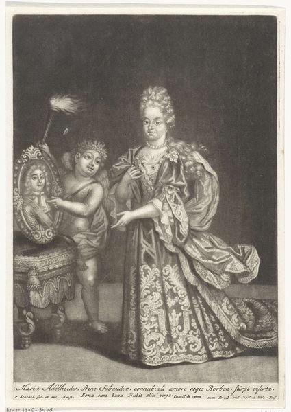 Editor: This engraving is entitled "Poesia", and it’s attributed to Jacob Gole. It seems to have been created sometime between 1670 and 1724. The material is engraving, which I can see from the fine lines. I'm really struck by how the artist manages to create depth and texture with just lines. What do you see in this piece, focusing on the artistic choices? Curator: The emphasis here lies in the structured composition and intricate detail. Note the calculated arrangement of forms—the figure, the table, the books—each element contributing to a balanced whole. Observe, too, how Gole manipulates light and shadow, not for mere realism, but to define form and accentuate the texture of the fabrics and surfaces. Consider the artist's technical prowess; how does the precise and deliberate nature of the engraving technique influence your interpretation of the work’s meaning? Editor: Well, the precision definitely gives it a sense of formality. It’s not a quick sketch; there's a deliberateness to every line, contributing to its academic art style, so it suggests a specific intent, maybe a certain reverence for poetry. I like how there are so many small details that combine together to create a really striking artwork. Curator: Exactly. We can appreciate how Gole’s expertise transforms a genre scene into a sophisticated artistic statement. How do you feel the materiality influences its perception today? Editor: I think knowing it's an engraving makes me appreciate it more. There’s something very appealing about the tactile nature of the lines and the skill involved in creating an image this detailed with just that medium. Curator: Indeed. It highlights the mastery inherent in traditional printmaking, drawing us back to contemplate the very essence of the artistic process and its enduring value.