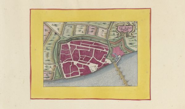 Editor: So, here we have an anonymous 17th-century watercolour illustration entitled "Vestingplattegrond van Libourne," or "Fortification Map of Libourne" from 1638. The intense pink colour dominating the centre is really striking. How do you interpret this work? Curator: That pink, for me, speaks volumes. Beyond mere aesthetics, consider what it represents within the context of 17th-century cartography. Maps were instruments of power, used to delineate territory, control populations, and project authority. The vibrant pink—likely artificial, not ‘natural’—could symbolize the coloniser’s imposed vision, transforming the landscape into something easily consumed and controlled. Think about the social implications of depicting a place not as it *is*, but as a tool for those in power. What does this flattening mean for the inhabitants? Editor: That's a really interesting point. It's easy to just see it as a pretty picture, but the pink does seem to impose a certain artificiality onto the scene. It’s almost…performative. Do you think that it serves as a kind of… symbolic warning of those boundaries and, potentially, consequences of crossing it? Curator: Precisely! And let’s consider the “fortification” aspect. Who were these fortifications *for*? Who were they keeping *out*? The map is silent on the experiences of those who may have resisted this imposed order. Maps are never neutral; they are always telling a story from a particular viewpoint. Think about the indigenous populations; what might a map *they* created have looked like? Whose stories are being prioritised? Editor: This definitely shifts my perspective. It is more than just a landscape or nice colours, it's about power, control, and who gets to write history – or, in this case, draw the map. Curator: Exactly. Questioning these seemingly objective representations helps us to unravel the complex narratives woven into the very fabric of our understanding of the world. It allows us to understand that landscapes contain historical echoes of identity, gender, race, and politics.