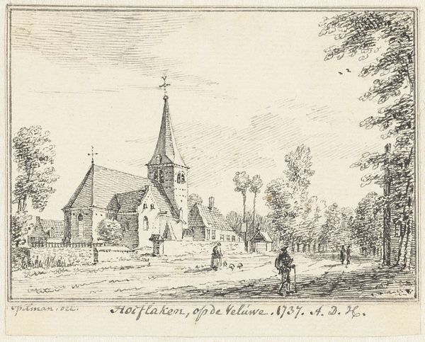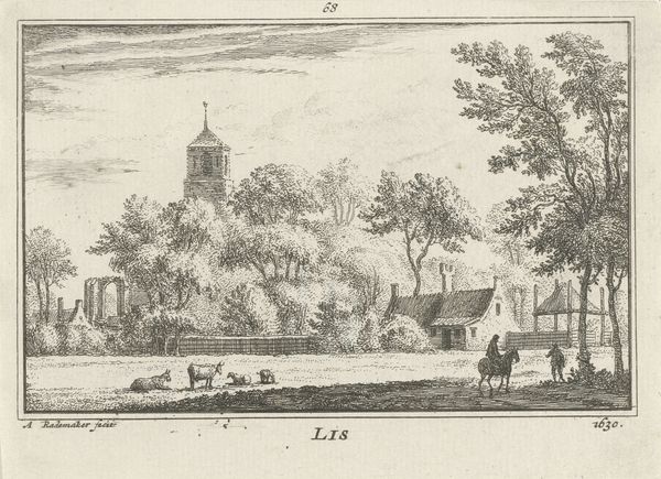 Curator: Welcome. We’re standing before “Gezicht op Castricum, 1622,” a print by Abraham Rademaker, created between 1727 and 1733. It's currently housed right here in the Rijksmuseum. The engraving offers a meticulously rendered view of Castricum, a town north of Amsterdam. Editor: It’s striking how much detail Rademaker manages to capture. Even in the small scale of the print, there’s a palpable sense of daily life. I find the overall atmosphere quiet, almost dreamlike, despite the bustling figures. Curator: Precisely. Rademaker’s prints, including this one, were widely distributed, contributing to a shared visual understanding, even a collective imagining, of Dutch landscapes. It’s interesting that although the engraving was made a century later, Rademaker inscribes the year 1622 in the lower part. This print, though not exactly a reliable record of daily life in 1622, shapes the viewers conception of that historical moment, a fabricated image acting as evidence of an imagined past. Editor: And it prompts me to wonder, what exactly was being commemorated? Or perhaps more aptly, what power dynamics are at play? The idyllic scene might obscure the hardships endured by many during the Dutch Golden Age—the pervasive wealth disparity, the implications of global trade fueled by colonialism, and the environmental concerns that marked the Dutch landscape in this period. Curator: Indeed. Prints like these played a crucial role in constructing a specific vision of the Netherlands. One often sanitized and idealized for public consumption, masking the socio-political realities that shaped that landscape. What we must realize is that such scenes are often carefully orchestrated representations of power. Editor: It’s in these absences—the stories untold, the perspectives omitted—that art gains its political weight, revealing just as much, if not more, than what is readily visible. And in looking critically we can reimagine those power structures. Curator: It gives one much to consider; now let us proceed onward toward the next masterpiece in our collection. Editor: A great way to contextualize and expand on our visual landscape—on to the next narrative!