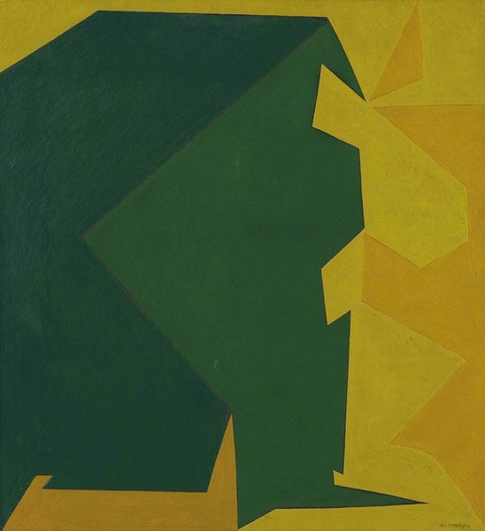 Curator: Look at this, an electrifying piece by Victor Vasarely, created between 1954 and 1955, titled "Larissa". Editor: It’s striking, immediately grabs your attention! The high-contrast geometric shapes feel almost like an optical illusion, vibrating on the canvas. Curator: Indeed. Vasarely was a key figure in the Op Art movement, which explored visual perception through geometric forms. Here, you can see his masterful control of shape and color to create that effect. But let's consider the materials: the specific pigments he chose, the canvas texture. These elements, often overlooked, are fundamental to the artwork’s presence. Editor: Right, but the *reception* of this piece, shown perhaps in a stark, white gallery space in the late 50s, would have been groundbreaking. Imagine the socio-cultural impact of such bold abstraction during a time when representational art still dominated. The very act of displaying such non-figurative works challenged artistic conventions. Curator: And let's think about the production. The hard-edge painting technique evident here demands a precision of line and form achievable through specific industrial tools and methods becoming prevalent in that era. It connects high art to the broader, changing landscape of manufacturing and design. Editor: Absolutely, and in understanding that socio-political context, we see museums, critics, and even collectors as active agents. Their roles dictate whose art gets seen, which stories get told, and ultimately, shapes our understanding of what is valued as art. Was "Larissa" initially embraced, or did it face resistance? The narrative of its acceptance is crucial. Curator: What fascinates me, stepping back, is this challenge of defining “craft” versus “fine art.” Vasarely embraced repeatable forms, almost like a factory production line, questioning those established hierarchies. Was it painting as commodity? That raises essential questions about the art world itself. Editor: Well, "Larissa" is a window into that cultural moment and that artistic experimentation, sparking discussions even today. I’m left thinking about how we still navigate abstraction and its role in shaping our visual culture. Curator: Me too! It has a profound testament to materiality and artistry during profound cultural change.