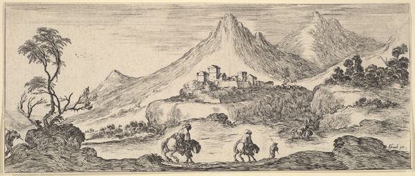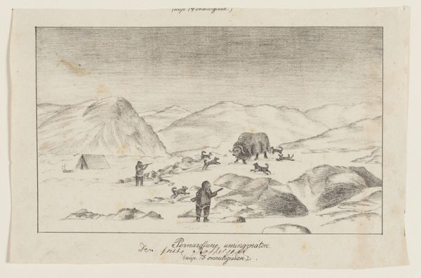 Curator: Victor Adam's piece, titled "Three soldiers in a landscape," completed sometime between 1820 and 1866, offers an interesting lens into the Romantic fascination with nature and military life. Editor: Wow, it feels very…distant. Almost like I'm looking through a dusty window into another century. There's a palpable sense of removed observation, the soldiers a bit isolated despite the vast landscape filled with what looks like their army. Curator: Exactly. Adam positions these soldiers within a panorama, likely informed by the period’s ongoing sociopolitical conflicts, to speak to power, but also to fragility. Notice how their smallness emphasizes nature’s dominance. Editor: That lone, scraggly tree on the left definitely pulls the eye. It mirrors, I think, a kind of resilience but also a vulnerability, mirroring those standing figures overlooking a world they are supposed to lead, and simultaneously at its mercy. Curator: Precisely. One could read it through the lens of post-Napoleonic Europe and the ongoing redrawing of boundaries along nationalistic and military lines. These were soldiers after all. Their identities and roles were constructed within very strict societal dictates. The land wasn't theirs either. Editor: It’s funny you say that, because as much as it’s a 'landscape,' I don't feel any sense of belonging. It’s like…a stage. A carefully constructed backdrop. The rendering in pencil makes it feel ethereal, yet the details of the military gear seem oddly sharp and precise. Curator: Adam was very skillful at deploying contrasts such as those. Consider how those military garments and towering headpieces were designed to evoke a sense of control. They're imposing but dwarfed, prompting reflections on masculinity, military might, and empire. Editor: Right, right! Like they're saying, "We're here. We command," while the whole world looms: a silent "Are you sure?" This reminds me of historical battle reenactments: a drama unfolding on a very indifferent stage, where only the players act as if they truly matter. Curator: A point well-taken! What resonates, ultimately, is how it allows us to examine the relationship between identity and place, performance and power, and how art like this preserves a nuanced view. Editor: Well, for me, the landscape whispers about our constant attempts to impose ourselves, which feel like a really persistent part of our nature. A powerful tension plays here, as everything, from mountains to single trees, watches on!
