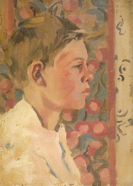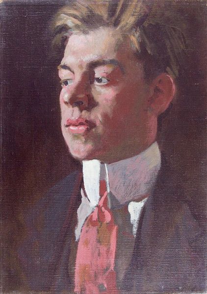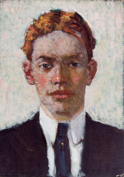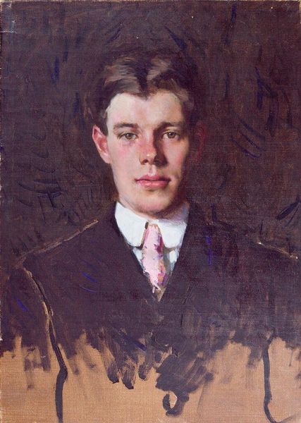 Curator: This is Denman Waldo Ross's painting, "Carl Peter Teigen," believed to have been completed sometime between 1897 and 1936. Editor: It’s quite a somber portrait, I think, despite the lively brushstrokes in the face and that bright bowtie. There is a looming shadow behind the sitter's head. Curator: Yes, the shadow could be interpreted as the weight of societal expectations or perhaps even the artist's own internal struggles projected onto the subject. It also looks a bit like a halo to me. Editor: Or, perhaps, it’s a comment on performativity. The shadow and neutral tones around Teigen suggest a constructed identity, like he's playing a role within specific social constraints. I wonder what Teigen was like outside of this staged setting. Curator: His gaze is intense. The use of light and shadow certainly imbues the figure with a sense of depth and, perhaps, hidden meaning. Editor: Ultimately, these are powerful reminders that portraits are not just representations, but subjective interpretations of identity and the social worlds it inhabits.