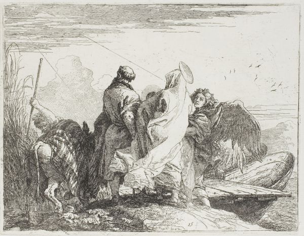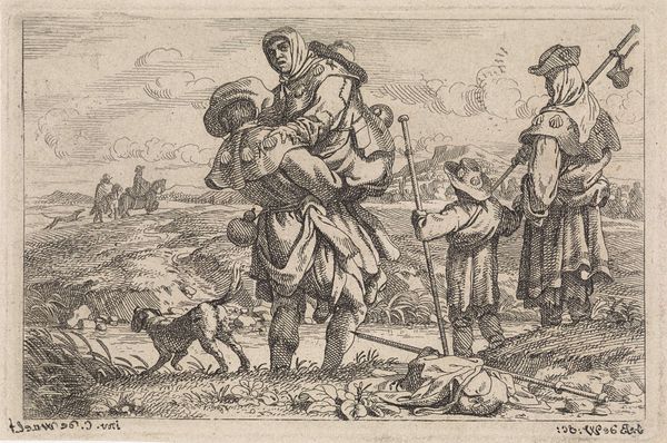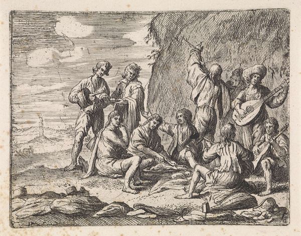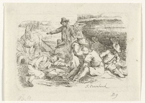 Jan van Ossenbeeck created this etching, "Six Beggars by a Fountain", sometime during his career in the 17th century. The composition immediately draws us in with its stark contrast between light and shadow, achieved through a dense network of etched lines. Observe how Ossenbeeck uses these lines not only to define form but also to create texture, giving a tactile quality to the beggars' worn clothing and the rough stonework of the fountain. The figures, slumped and weary, are arranged in a semi-circular fashion around the fountain, creating a sense of enclosure and shared plight. Yet, this arrangement is disrupted by the standing figure, his outstretched arm seemingly indicating a path or perhaps a futile gesture of hope. Ossenbeeck's strategic deployment of line and form challenges the viewer to reflect on the structure of society itself, and the place of those marginalized within it. This is a profound contemplation on the human condition, rendered with both technical skill and philosophical depth.