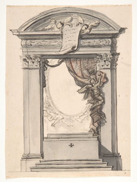 Editor: Here we have Louis Gustave Taraval’s "Design for a Pulpit," dating from around 1750-1794. It's a drawing and print, currently housed at the Met. The precision of the architectural drawing is striking! How might we interpret its place within Neoclassical art production? Curator: We must consider the labor and materials embedded within its creation and intended reception. Look at the meticulous lines of the drawing, clearly intended for mass reproduction through printmaking. This isn’t simply an elevation; it's a proposal for a *product*, to be constructed using stone, plaster, perhaps even cheaper, readily available materials to be replicated throughout the city or region. The illusion of grandeur serves a very material, persuasive purpose. Editor: That makes sense. The very act of mass producing what is meant to feel unique and awe-inspiring! It almost undercuts the spirituality. Curator: Precisely. And think about the labor involved in both the creation of the design and its potential physical manifestation. Artisans, stonemasons, carpenters, all contributing their skills to create this object, destined for use in service of power structures. What social implications might follow from the making of it? Editor: The Pulpit as stage for the priest to stand, not to mention, where he can influence consumption and manipulate behavior of people within earshot of his elevated voice. So, it all comes down to purpose. This drawing’s main value rests in understanding that architectural works from the Neoclassical era—often viewed through a lens of timeless elegance—were materially driven projects, made and used within an economy. Curator: Indeed. And with a closer consideration of that material reality, our appreciation moves beyond aesthetic admiration toward critical awareness. Editor: I will never see a drawing or building the same again! Thanks for sharing your perspectives with me.