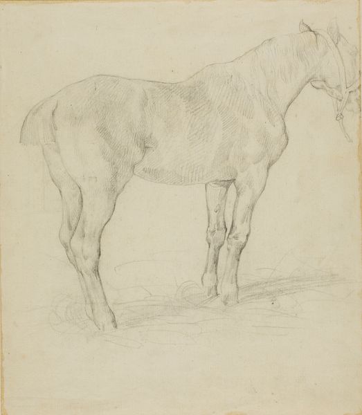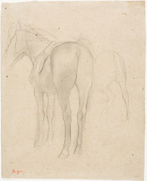 Curator: Observing Jan Kuyper's "Studies van een Paard," dating roughly from 1855 to 1912, I immediately get a sense of transience, like capturing a fleeting moment in pencil on paper. Editor: Fleeting, yes, but also revealing of the deeply ingrained relationship between humans and horses within a particular societal structure. Think about how crucial horses were for labor, transportation, even warfare during this era. This drawing, seemingly simple, speaks to a history of power and dependency. Curator: It feels almost ethereal to me. The unfinished quality of the lines hints at movement, a gentle dance frozen in time. You can almost feel the soft warmth of the horse just by looking at this piece. It’s really interesting what is not actually shown. Editor: The sketch's incompleteness mirrors the larger social dynamics at play, though. It begs the question of who owned or commissioned a study like this. Class divisions influenced the subjects people had the leisure to depict. Even seemingly neutral images like these are rarely detached from their historical circumstances. Curator: Maybe, but couldn’t it also be the artist simply trying to grasp the form? To just… feel the energy of the horse flow through his pencil? Not everything has to be related to socioeconomic factors. Can we, just for a moment, allow art to be intuitive? Editor: I understand the desire for intuition, but these are not mutually exclusive. Art IS always intuitive and born of impulse, but even spontaneous art arises in the face of social considerations. Consider gender too; being a male artist grants an automatic privilege of expression often denied to women of that era. We should ask whose stories and experiences are represented in collections like this. Curator: Ah, but the beauty lies, in a certain sense, beyond these limits that were defined for and against others, the very act of creation being an assertion of existence, if I might take it there. Anyway, look at how he subtly suggests weight and muscle, and manages to capture the stillness of the horse with such minimal effort, using delicate shading! It gives us an immediacy. It is absolutely divine! Editor: Divine yes, but this brings up other social and labor dimensions too! Where was the horse located, who attended it, who were these workers and where is their perspective here. I concede that it is quite good as far as capturing weight and texture! I believe it calls to reflect about who produces or consumes a cultural item, for to simply aestheticize an artwork such as this risks obscuring underlying injustices. Curator: Well, on that note, I feel like I’m understanding a little more deeply how you view art! Editor: As I understand your perspective, as well.
