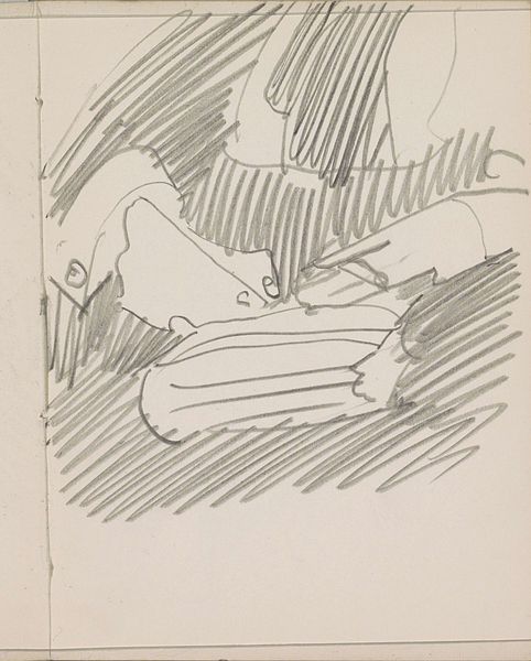Reijer Stolk drew 'Twee zittende mannen' with a pencil, somewhere around the early to mid 20th century, capturing two seated men with an economy of line. The pencil marks are tentative, almost searching, which gives you the feeling of being present in the moment of creation. There’s a real sense of process here. Look at the way the lines describe the figures, they’re not closed off, not precious; the artist is figuring it out as he goes along. The men are reduced to their barest essence; a hat, a leg stretched out, the curve of a back. I’m really drawn to the man lower down the page, the line describing his left leg is particularly fluid and lovely, and the way it just stops, unfinished, makes me think about how much information our brains fill in when we look at an image. Stolk's simple drawing reminds me of some of Guston’s late works, there is a similarly casual approach, yet they are deceptively skillful. They remind us that art doesn't always need to shout; sometimes, the quietest voices are the most profound.