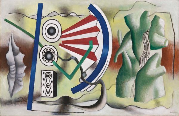 Curator: This is "Obraz," a 1932 mixed-media painting by Jindrich Styrsky. It exemplifies his engagement with surrealism. Editor: It feels strangely serene despite its abstract nature—a pastel dreamscape interrupted by what seem to be fragments of reality. There's a fragmented Greco-Roman figure in the top left... the materials create an illusion of rough stone. Curator: Exactly. Styrsky used paint and other mixed media to construct this composition, creating varied textures. His layering technique hints at a process of assemblage and deconstruction, mirroring the social and political turmoil of the time. How do the materials convey or undermine meaning? It's a balancing act of making and unmaking. Editor: The juxtaposition of the soft background with the rigid geometric shapes draws me to ponder the political landscape of the early 1930s—this was an era defined by a stark tension between emerging modernity and a lingering attachment to classical ideals. The classical sculpture's disintegration may be symbolic. Curator: The disjunctions invite interpretations along precisely those lines. I wonder how this relates to Surrealist theory that aimed to challenge conventional assumptions through the combination of the rational and irrational, the conscious and the unconscious. The means become very important: what type of paint, from what sources, was it manufactured for? Where do those materials fit into consumer culture? Editor: That prompts us to investigate beyond pure formalism, as such artistic ventures have socio-political intentions deeply enmeshed within them. It certainly underscores that the artist consciously intended the deconstruction of ideals, reflecting on a world gripped by anxieties around identity and societal values. Curator: Indeed. The fragmented statue combined with the basic geometric figures forces one to ponder how abstraction allows the materials and forms themselves to represent something far greater. This method is not mere detachment; it can serve as an activist lens. Editor: I’m particularly moved by the tension of destruction and rebuilding—themes which still resonate profoundly. Curator: Agreed, it certainly speaks volumes, and continues to encourage new considerations across contexts of medium, labor, and society.