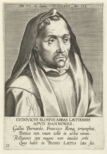 Curator: Before us is a work titled "Portret van Jacobus Latomus," created in 1572 by Philips Galle. It currently resides in the Rijksmuseum. My immediate thought is the stark contrast of light and shadow; it really grabs your attention. What's your take? Editor: I'm immediately struck by the texture. The way the lines carve out the folds in the clothing, the almost metallic sheen of the fabric - it’s all crafted so deliberately. You can sense the engraver’s hand at work. Curator: Indeed. Galle, active in a period of significant religious and political upheaval, often made prints with subtle, politically charged messaging. Latomus, as a theologian, would have been a prominent figure in those debates. These portraits served a crucial role in establishing a public persona for influential people like him. Editor: And you see it reflected in the materials too. The choice of printmaking, specifically engraving, meant this image could be reproduced and widely circulated. It speaks to a desire to disseminate Latomus’s image and, by extension, his ideas to a broader audience. It makes one think of the accessibility and scale that print-making introduced compared to single painted portraits, or even manuscript illuminations. Curator: Exactly! The Latin inscription reinforces that accessibility by spreading knowledge of the theologian beyond the circles who knew him directly. But how does it connect with ideas of labor, or making do you think? Editor: Well, each line in that engraving had to be carved individually, likely after numerous drawings, so the level of focused labour, to create so precise an image is rather incredible. This craft and skilled execution adds an air of authority and lasting importance, both to the theologian and his work. Curator: I hadn't thought of it in terms of skilled execution, more the opposite really! Almost the banality of its function to proliferate his image as efficiently as possible. Still, there's undeniably skill here, whether as purely art, or political function. Editor: It makes you really wonder about all of the skilled, but maybe anonymous makers who’s efforts have worked to frame powerful images. Thanks for bringing it to my attention in all these interesting historical aspects! Curator: And thank you for grounding us with those realities, in process.